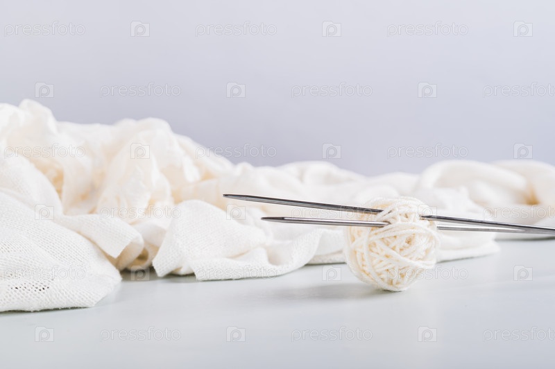 Вязальные спицы торчат из клубка пряжи и трикотажного полотна рядом на синем фоне