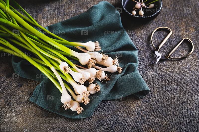 Новый модный овощной сладкий чеснок на скатерти на столе