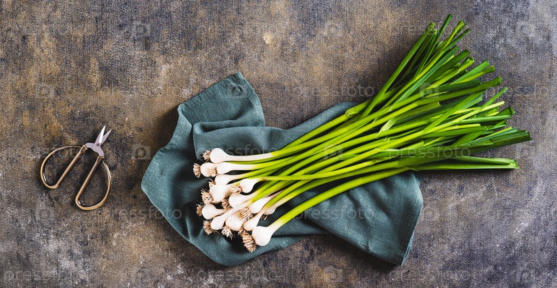 Новый модный овощной сладкий чеснок на ткани на столе, вид веб-баннера