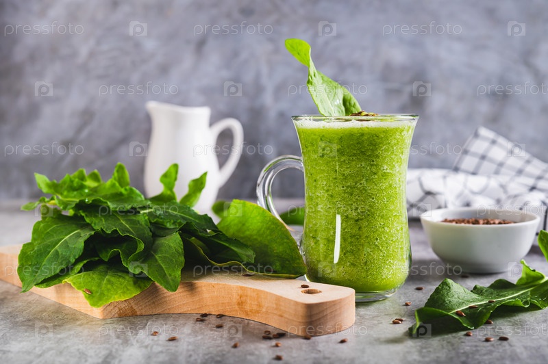 Освежающий коктейль из листьев щавеля и семян льна в стакане на столе