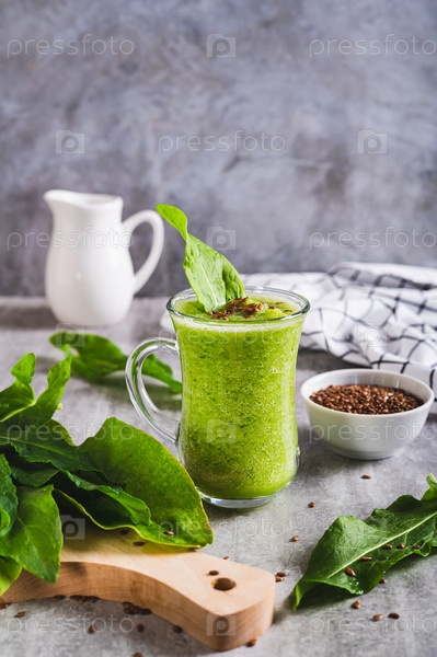 Освежающий коктейль из листьев щавеля и семян льна в стакане на столе, вертикальный вид