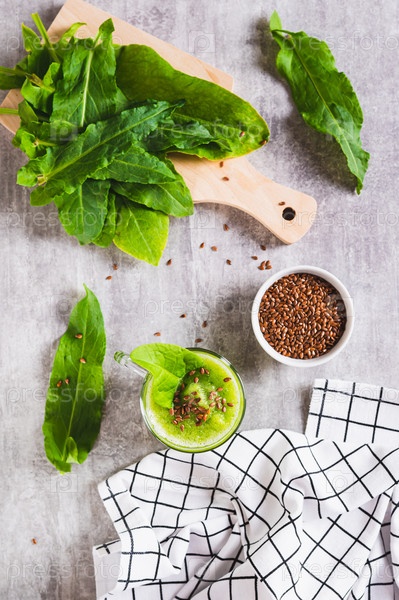 Детокс-смузи из зеленого щавеля и семян льна в стакане на столе и вертикальном виде
