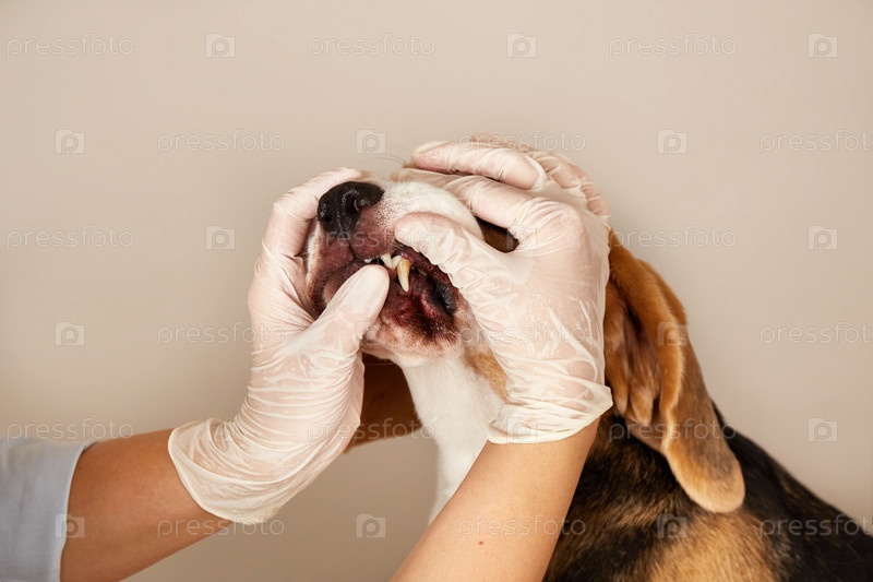 Ветеринар проверяет зубы собаки породы бигль, наличие налета или зубного камня у собаки