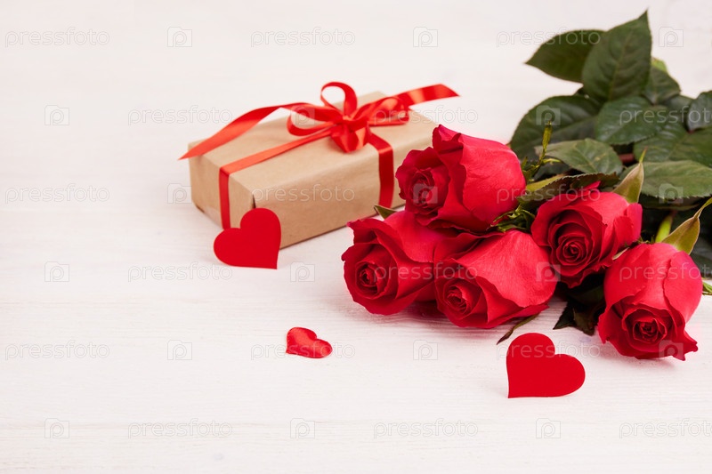 Букет красных роз, коробка в крафт-бумажном пакете с красной лентой