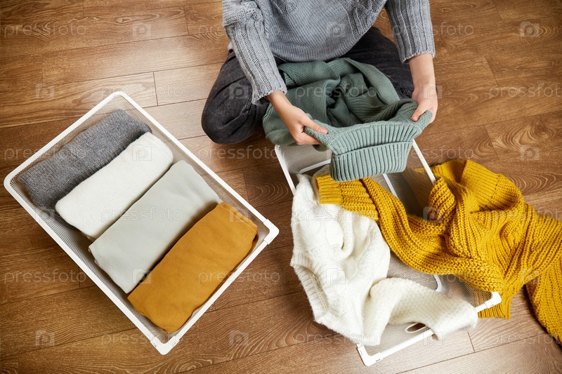 Молодая женщина аккуратно складывает стопку одежды в металлическую корзину для белья