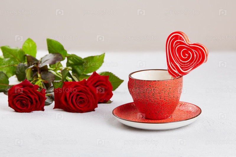 Красная чашка с леденцом в форме сердца, букет красных роз