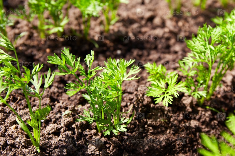 Овощная грядка из молодой моркови. Молодые ростки моркови в почве