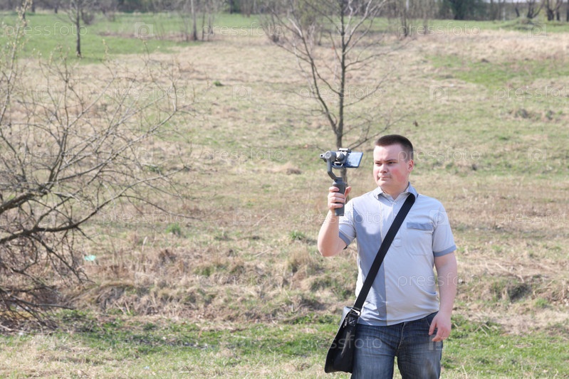 Молодой человек снимает видео на смартфон. Использует подвес для получения плавных кадров. Внимательно наблюдаю за съемками фильма