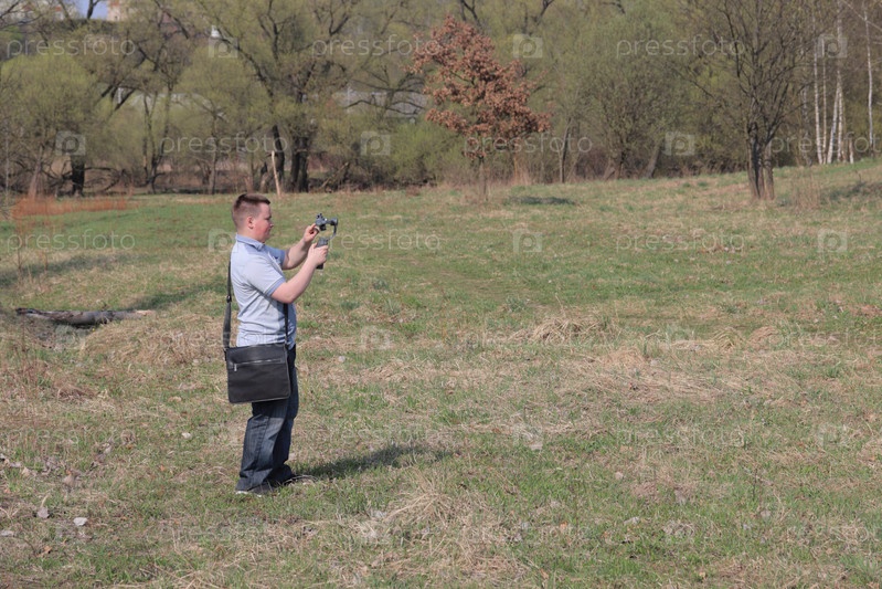 Молодой человек снимает видео на смартфон. Использует подвес для получения плавных снимков. Управляет записью, касаясь экрана