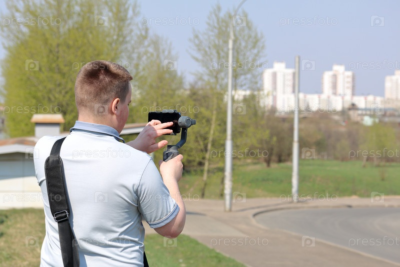 Молодой человек снимает видео на смартфон. Использует подвес для получения плавных снимков. Управляет записью, касаясь экрана