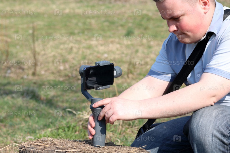 Молодой человек снимает видео на смартфон. Использует подвес для получения плавных кадров. Внимательно наблюдаю за съемками фильма