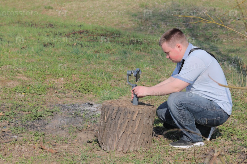 Молодой человек снимает видео на смартфон. Использует подвес для получения плавных кадров. Внимательно наблюдаю за съемками фильма