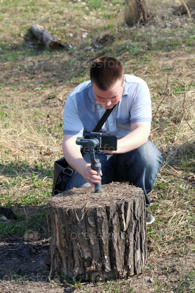 Молодой человек снимает видео на смартфон. Использует подвес для получения плавных снимков. Управляет записью, касаясь экрана