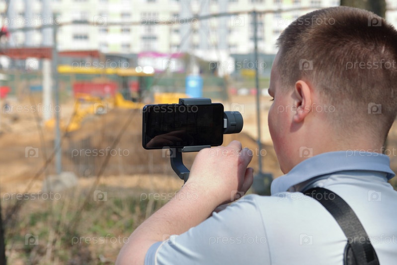 Молодой человек снимает видео на смартфон. Использует подвес для получения плавных кадров. Внимательно наблюдаю за съемками фильма