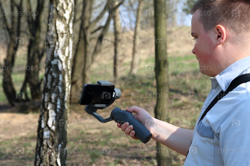 Молодой человек снимает видео на смартфон. Использует подвес для получения плавных кадров. Внимательно наблюдаю за съемками фильма
