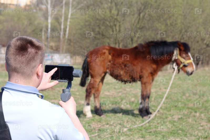 Молодой человек снимает видео на смартфон. Использует подвес для получения плавных снимков. Управляет записью, касаясь экрана