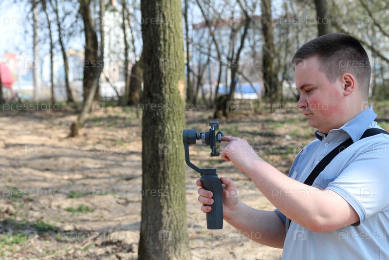Молодой человек снимает видео на смартфон. Использует подвес для получения плавных снимков. Управляет записью, касаясь экрана
