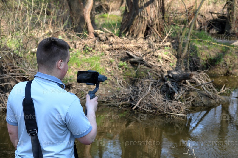 Молодой человек снимает видео на смартфон. Использует подвес для получения плавных кадров. Внимательно наблюдаю за съемками фильма