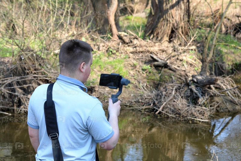 Молодой человек снимает видео на смартфон. Использует подвес для получения плавных кадров. Внимательно наблюдаю за съемками фильма