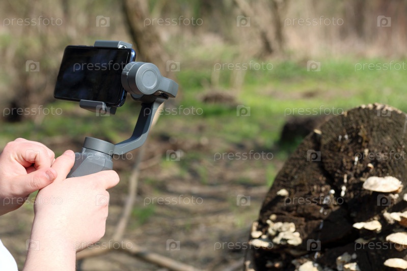 Молодой человек снимает видео на смартфон. Использует подвес для получения плавных кадров. Внимательно наблюдаю за съемками фильма
