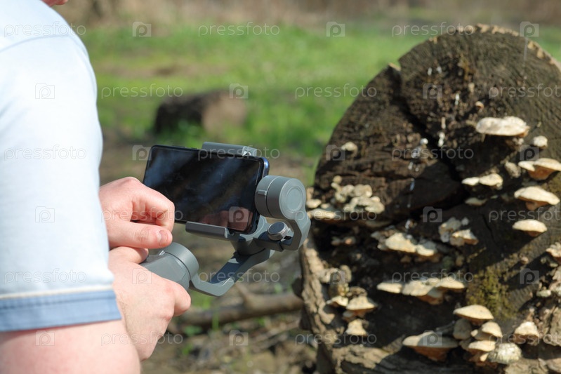 Молодой человек снимает видео на смартфон. Использует подвес для получения плавных кадров. Внимательно наблюдаю за съемками фильма