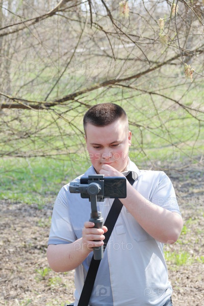 Молодой человек снимает видео на смартфон. Использует подвес для получения плавных кадров. Внимательно наблюдаю за съемками фильма