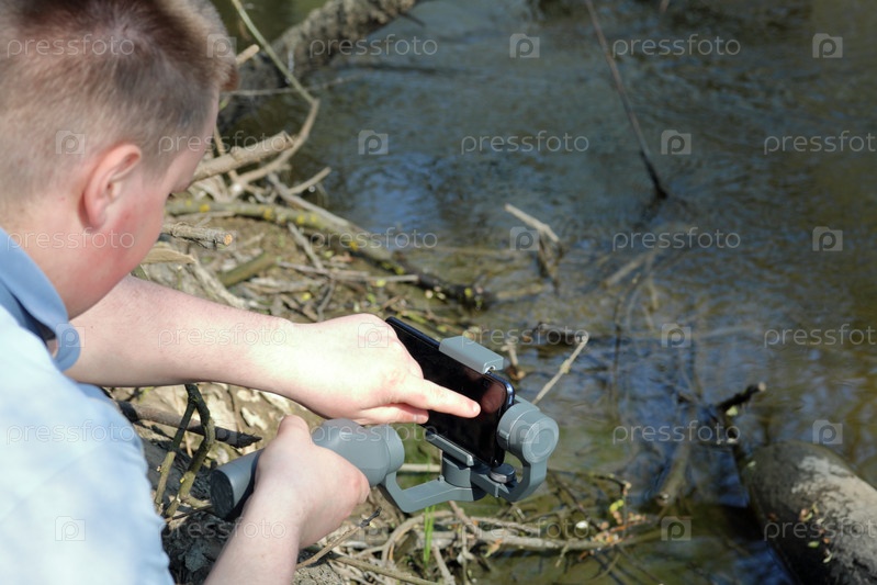 Молодой человек снимает видео на смартфон. Использует подвес для получения плавных снимков. Управляет записью, касаясь экрана