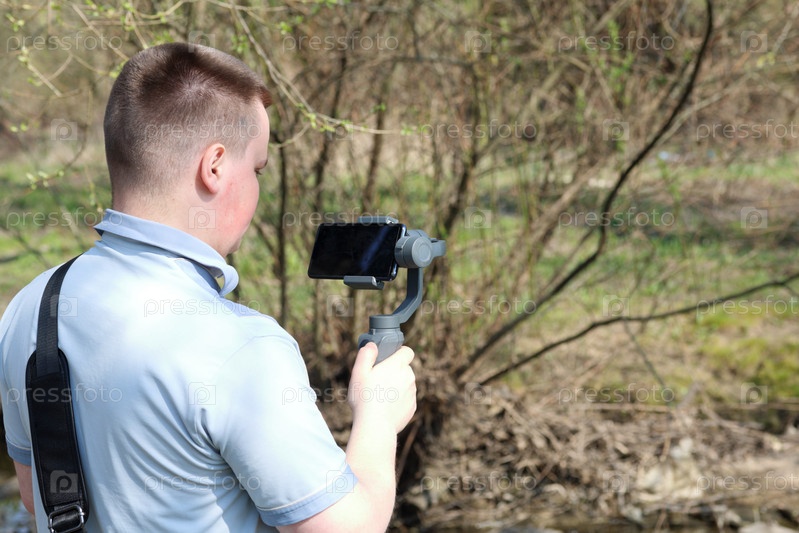 Молодой человек снимает видео на смартфон. Использует подвес для получения плавных кадров. Внимательно наблюдаю за съемками фильма
