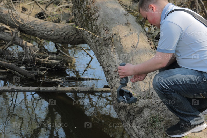 Молодой человек снимает видео на смартфон. Использует подвес для получения плавных кадров. Внимательно наблюдаю за съемками фильма