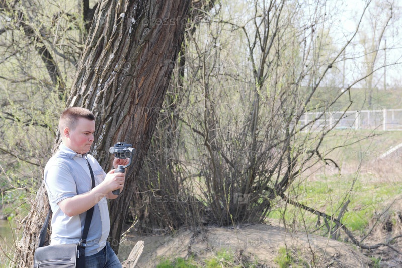 Молодой человек снимает видео на смартфон. Использует подвес для получения плавных кадров. Внимательно наблюдаю за съемками фильма