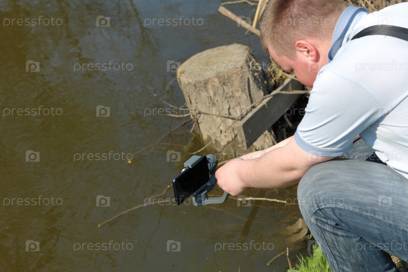 Молодой человек снимает видео на смартфон. Использует подвес для получения плавных кадров. Внимательно наблюдаю за съемками фильма