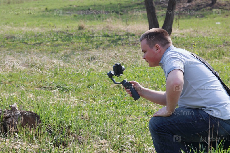Молодой человек снимает видео на смартфон. Использует подвес для получения плавных кадров. Внимательно наблюдаю за съемками фильма