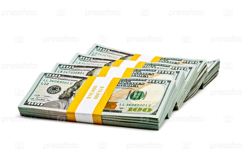 Креативная концепция финансирования бизнеса, зарабатывающая деньги - стопка пачек банкнот номиналом 100 долларов США 2013 года, изолированных на белом
