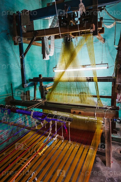 Мужчина ткет шелковое сари на ткацком станке в Индии