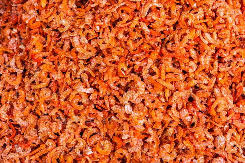 Сушеные креветки закрываются на рынке в Азии