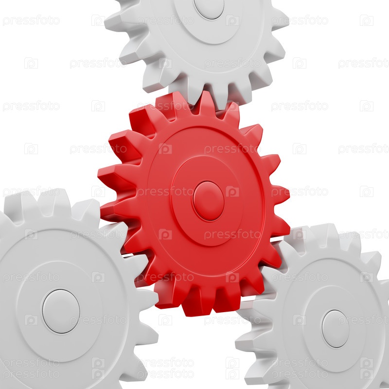 Концепция партнерства, лидерства, успеха в командной работе - зубчатые колеса, работающие вместе, изолированные на белом