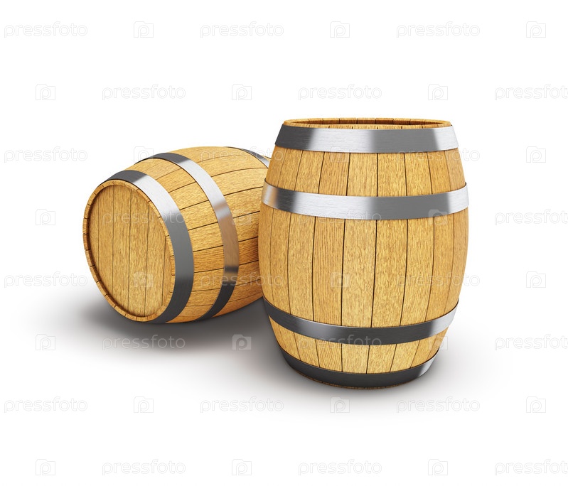 Деревянные дубовые бочки с бренди и пивом, изолированные на белом фоне