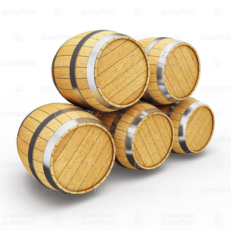 Деревянные дубовые бочки с бренди и пивом, изолированные на белом фоне