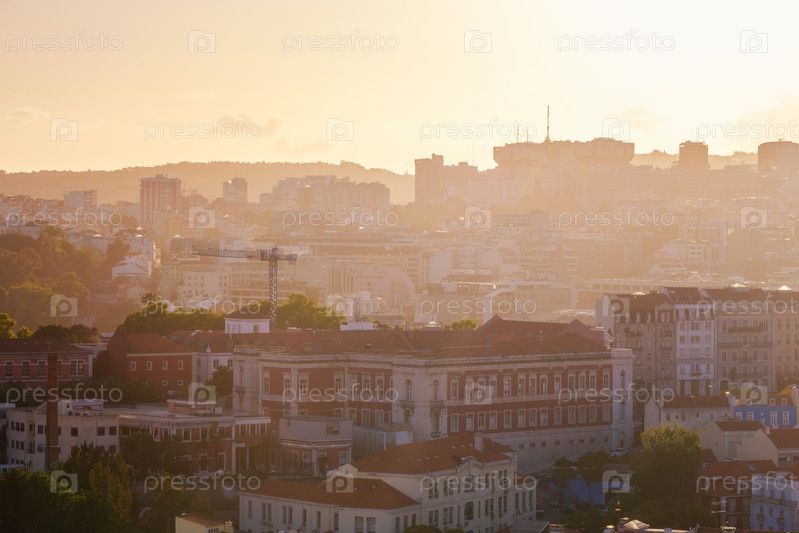 Вид на Лиссабон на закате со смотровой площадки Мирадуро-да-Сеньора-ду-Монте. Лиссабон, Португалия
