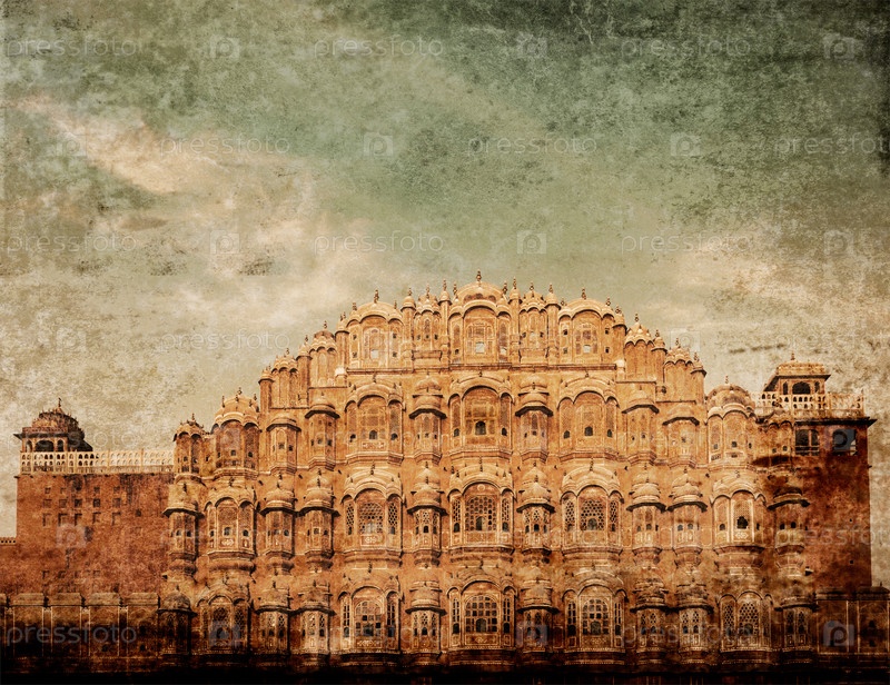 Винтажный ретро-хипстерский туристический образ знаменитой достопримечательности Раджастана - дворец Хава-Махал (Дворец Ветров), Джайпур, Раджастан с наложенной гранжевой текстурой