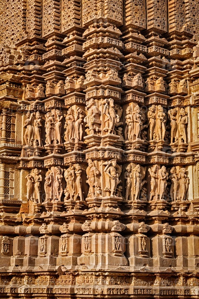 Каменные барельефные скульптуры на храме Ваман, известном индийском туристическом объекте Кхаджурахо, Мадхья-Прадеш, Индия