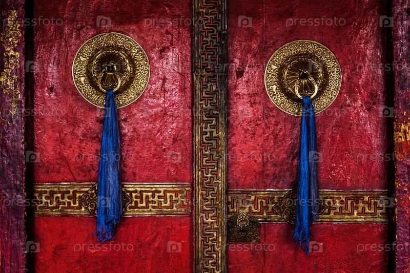 Ворота Спитук Гомпы (тибетский буддийский монастырь) с украшенными орнаментом дверными ручками. Ладакх, Индия