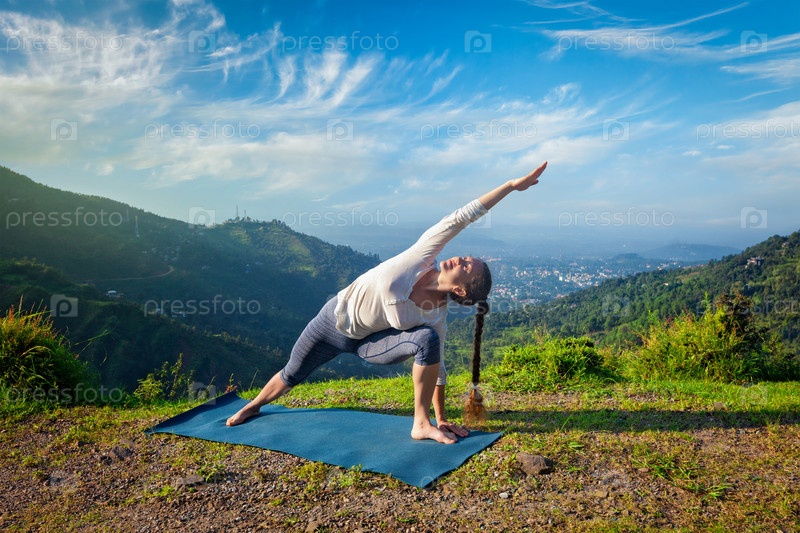 Спортивная женщина занимается йогой асана Уттхита Паршваконасана - поза с расширенным боковым углом на открытом воздухе в горах утром