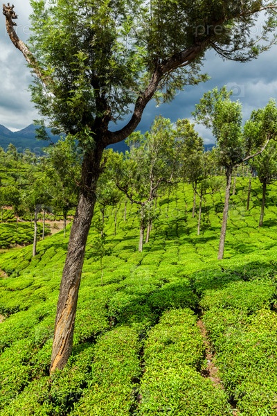 Керала, Индия, путешествие - плантации зеленого чая с деревьями в Муннаре, Керала, Индия, крупным планом