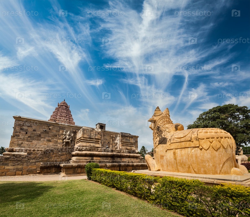 Индуистский храм Гангай Конда Чолапурам с гигантской статуей быка Нанди. Тамил Наду, Индия