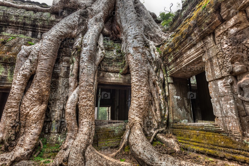 Концепция путешествия в Камбоджу - древние каменные двери и корни деревьев, руины храма Та Пром, Ангкор, Камбоджа