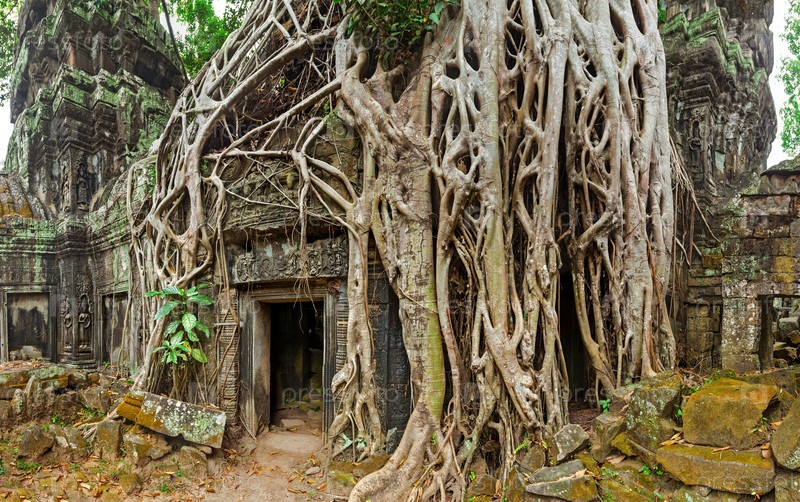 Древняя каменная дверь и корни деревьев, храм Та Пром, Ангкор, Камб