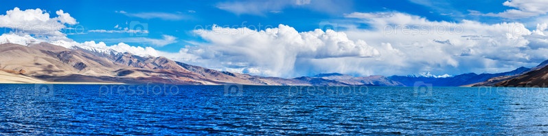 Панорама гималайского озера Цо Морири (официальное название - Заповедник водно-болотных угодий Цоморири) в Гималаях, Корзок, район Чангтанг, Ладакх, Джамму и Кашмир, Индия