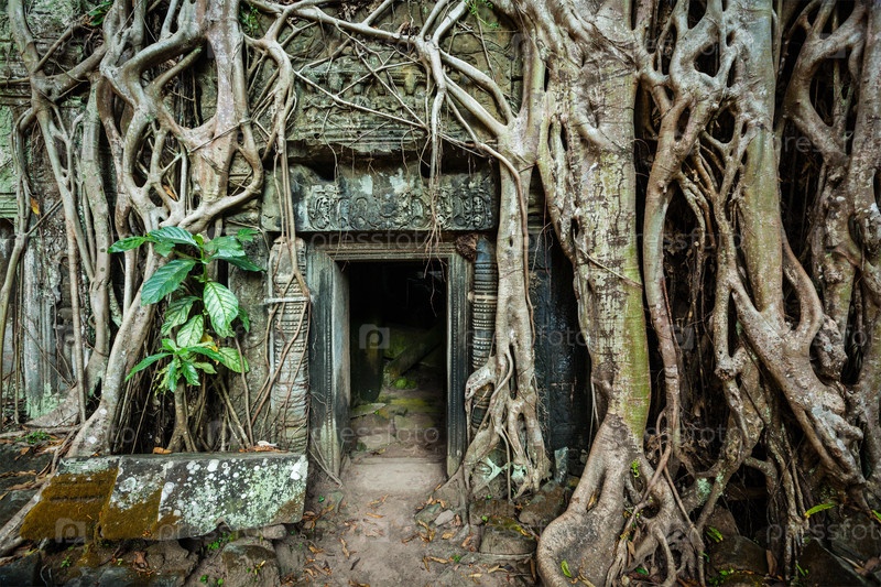 Концепция путешествия в Камбоджу - древние каменные двери и корни деревьев, руины храма Та Пром, Ангкор, Камбоджа