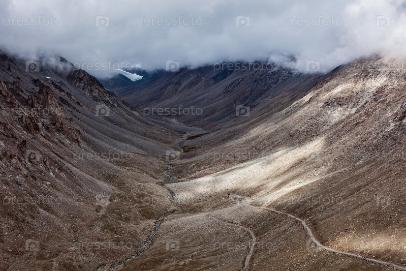 Пейзаж Гималайской долины с дорогой возле перевала Кунзум Ла - предположительно самого высокого перевала в мире (5602 м), Ладакх, Индия